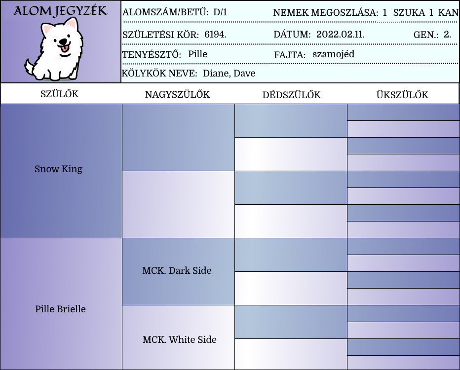 A mai napon, ebin a 6194. körben megszületett a D/1 jelzésű szamojéd almom. A fajtából ez a 4. alom, és 9. a tenyészetben. 2 kölyök született, 1 szuka, 1 kan, 2. generációsak.